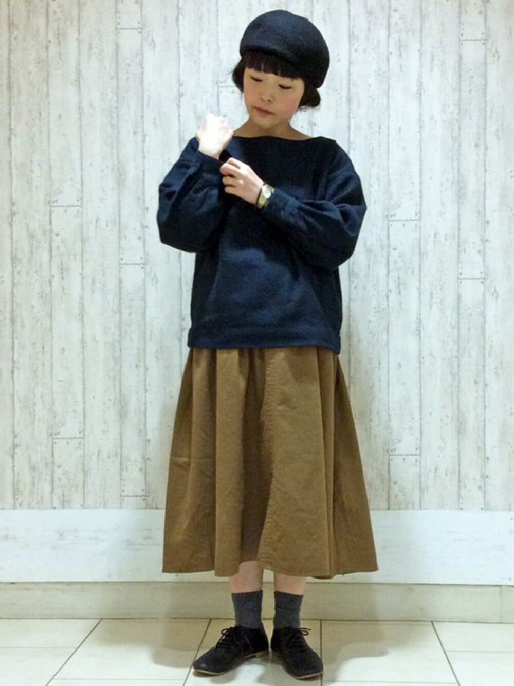 甘めのアイテムを、深いカラーでまとめたコーディネート。 ブラウスは、袖がバルーンになっていてキュート♪ スカートは、長さの調節できるサスペンダーがついていますので、トップスインスタイルもおすすめです。