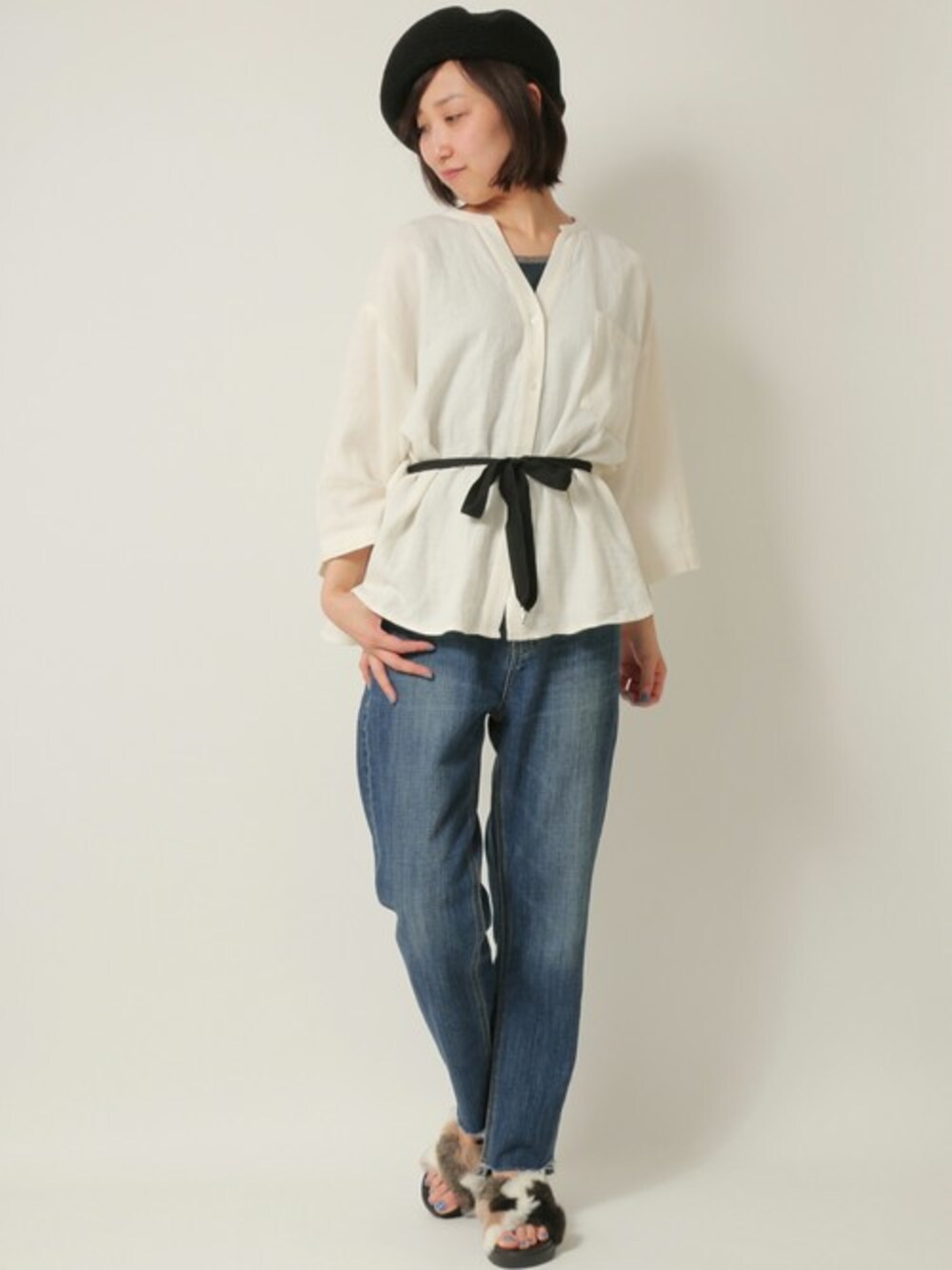 オトナのデニムコーディネート。 ハトメ使いのウエストマークブラウス。 シンプルなブラウスですが、ウエストリボンがあるだけで簡単に今っぽい雰囲気に♪ 肌触りのよいふんわり生地で、今すぐ着られる7分袖です。