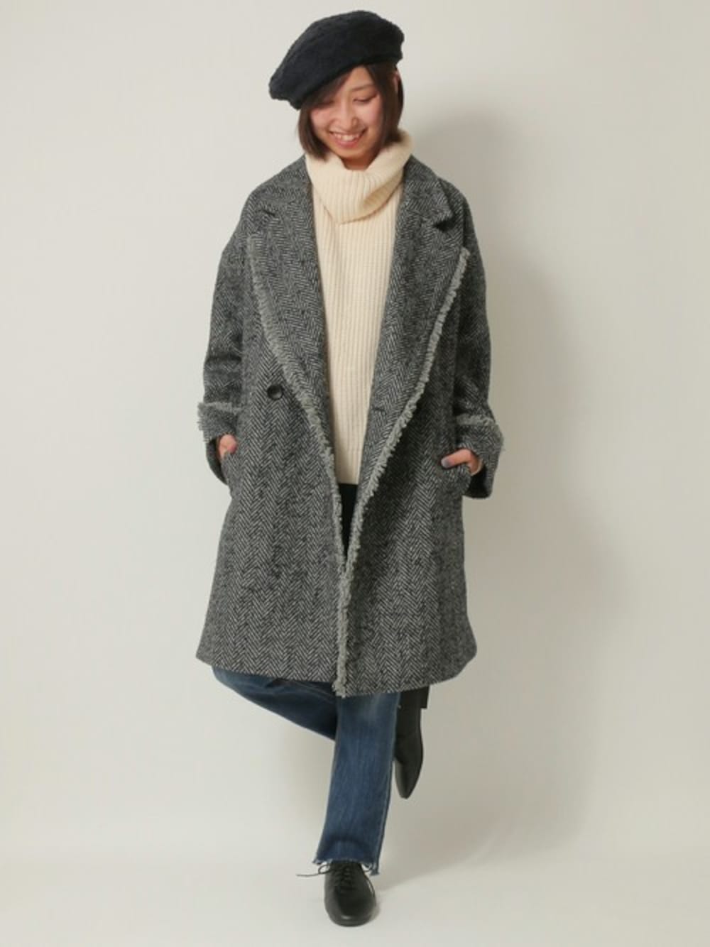 しっかり感が新鮮なコート×デニムスタイル。 トラディショナルかつ紳士的な雰囲気のあるヘリンボーンコートですが、シルエットをビッグサイズにすることでぐっと今っぽく仕上がりました。 袖周りや身幅にゆとりを出し、厚手のニットなどに羽織ってももたつかず寒がりさんでも安心です♪