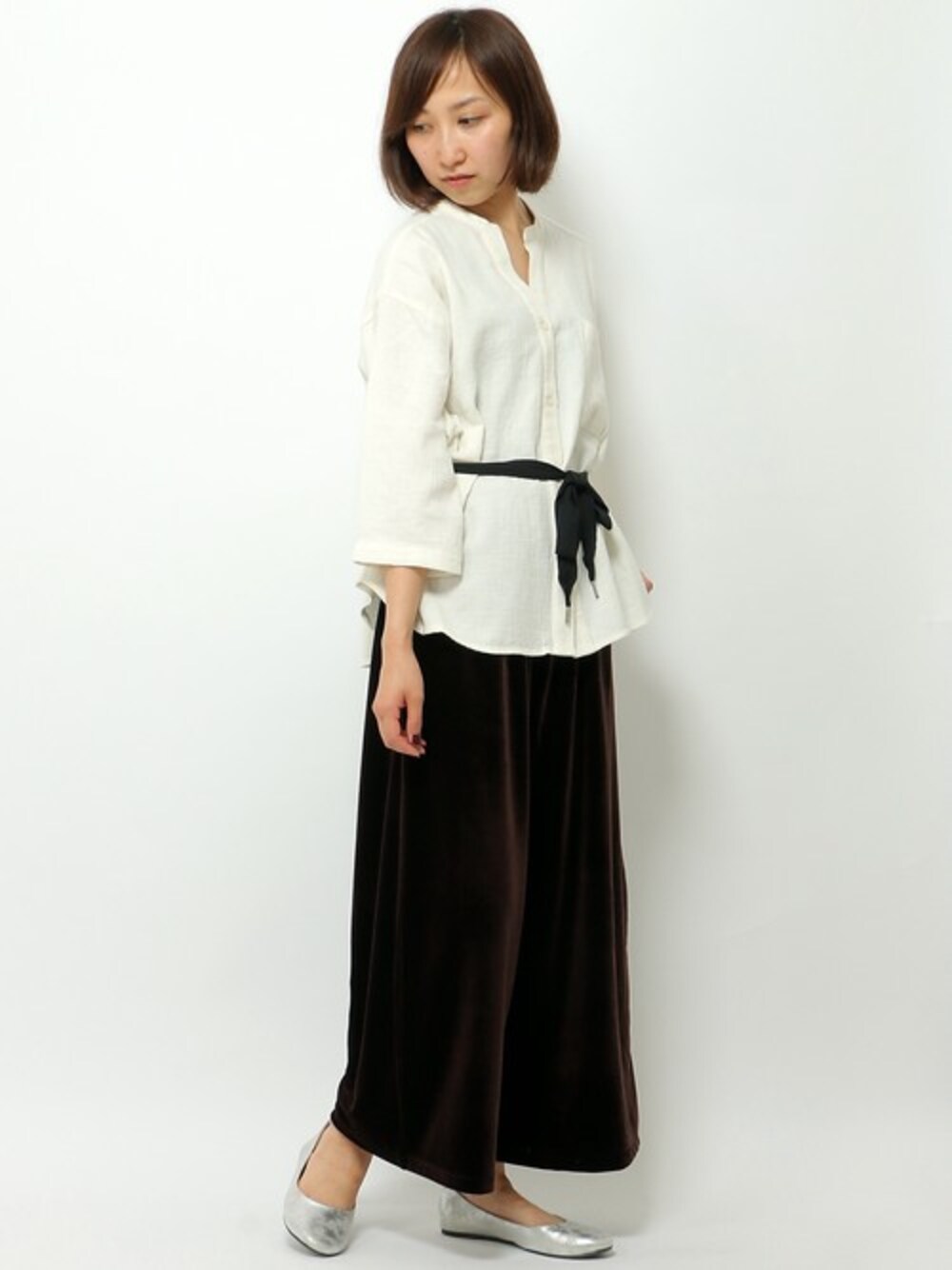 ホワイト×ブラウンのきれいめ大人コーデ。 配色のウェストリボンが今年らしいブラウスに、べロアパンツをあわせました。 ワイドシルエットのベロアパンツは、ウェストゴムのらくちんアイテムでありながら、ニュアンスのある光沢がどこかクラシカルな雰囲気を楽しめる一枚です。