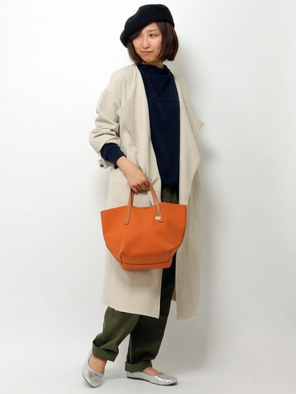 上品な中にも個性の光る大人のカジュアルコーデ。 ゆるっとラフに着流す感じが今年らしいガウンコートは、季節の変わり目にピッタリな羽織としてデイリーに活躍するアイテム。 トレンドのベーカーパンツとあわせればこなれ感がグッとUPします♪ アクセントには、まるでリアルのようなきれいな風合いのフェイクスウェードトートをあわせました。