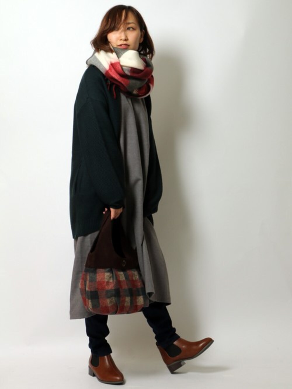 シンプルワンピース×チェック小物のおでかけコーデ。 ベーシックなVネックワンピースに、アカのアクセントが効いています♪