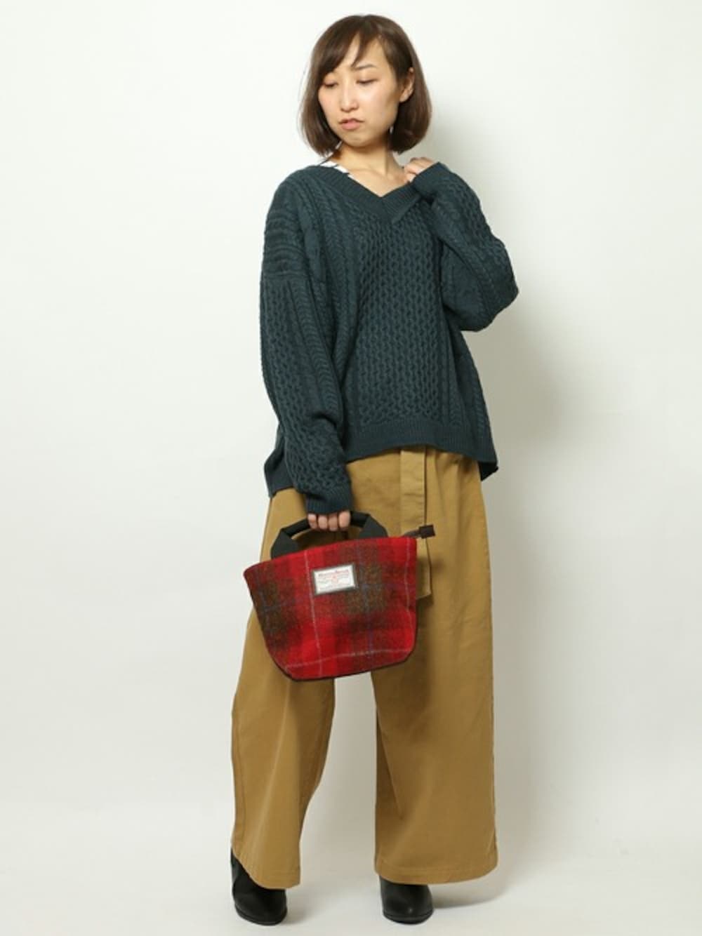 秋冬定番のケーブルニットは、ゆったりサイズに深めのVネックが今どきポイント。 インにレースアイテムやスタンドネックのブラウスなどを着てレイヤードを楽しむのもおすすめ♪ ボリュームニットならではのざっくり感が魅力です。