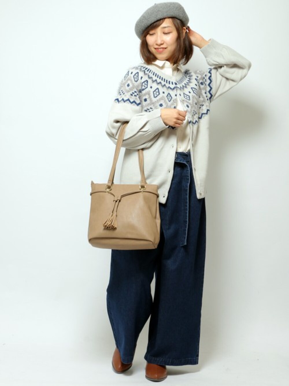 伝統的なノルディックセーターを思わせる求心柄のニットカーディガン。 柄の一部にフェザーヤーンを使い表情を持たせました。 比較的首のつまったクルーネックスタイルなので、ボタンを閉めればプルオーバー感覚でも着用して頂けます。 インにスタンドネックのブラウスなどを着用するのも今っぽくておすすめ♪
