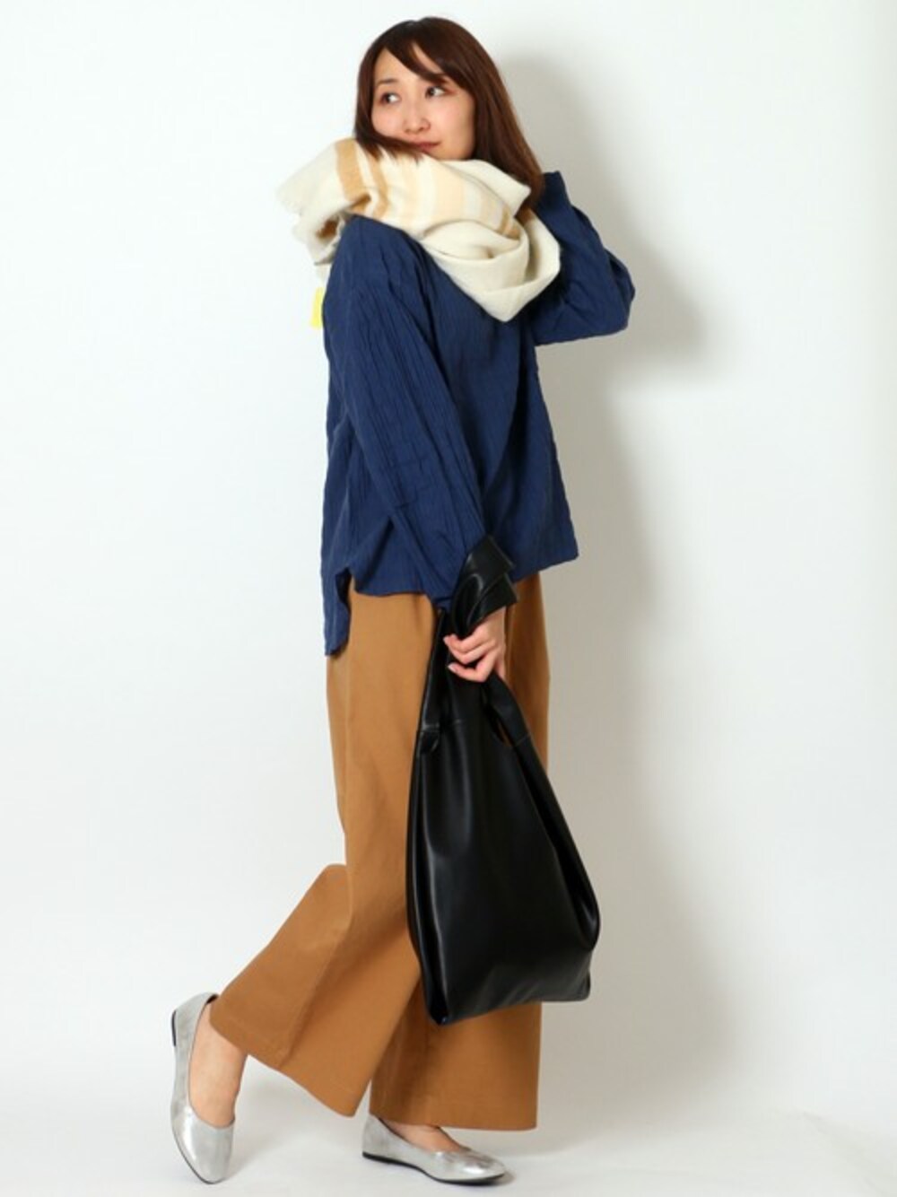 ワッシャー加工みたいな風合い、ふんわりとしたタッチが心地よいブラウスです。 袖は少し丸みを出していて、身幅広めのゆったりシルエット。 中に着込めるので、ハイネックカットソーなどとレイヤードして着こなすのもおすすめです♪