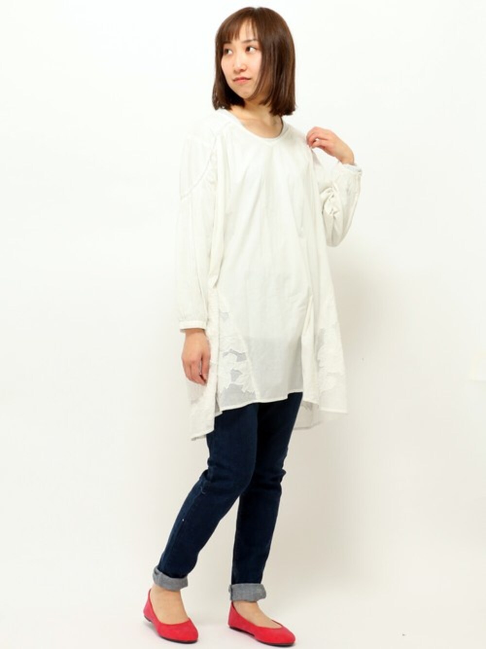 メッシュ素材に刺繍をしたワザありブラウスです。 体のラインを拾わずふんわりと着こなせるチュニック丈。 スキニーやテーパードパンツなど、スリムボトムと合わせてコーディネートしたいアイテムです。