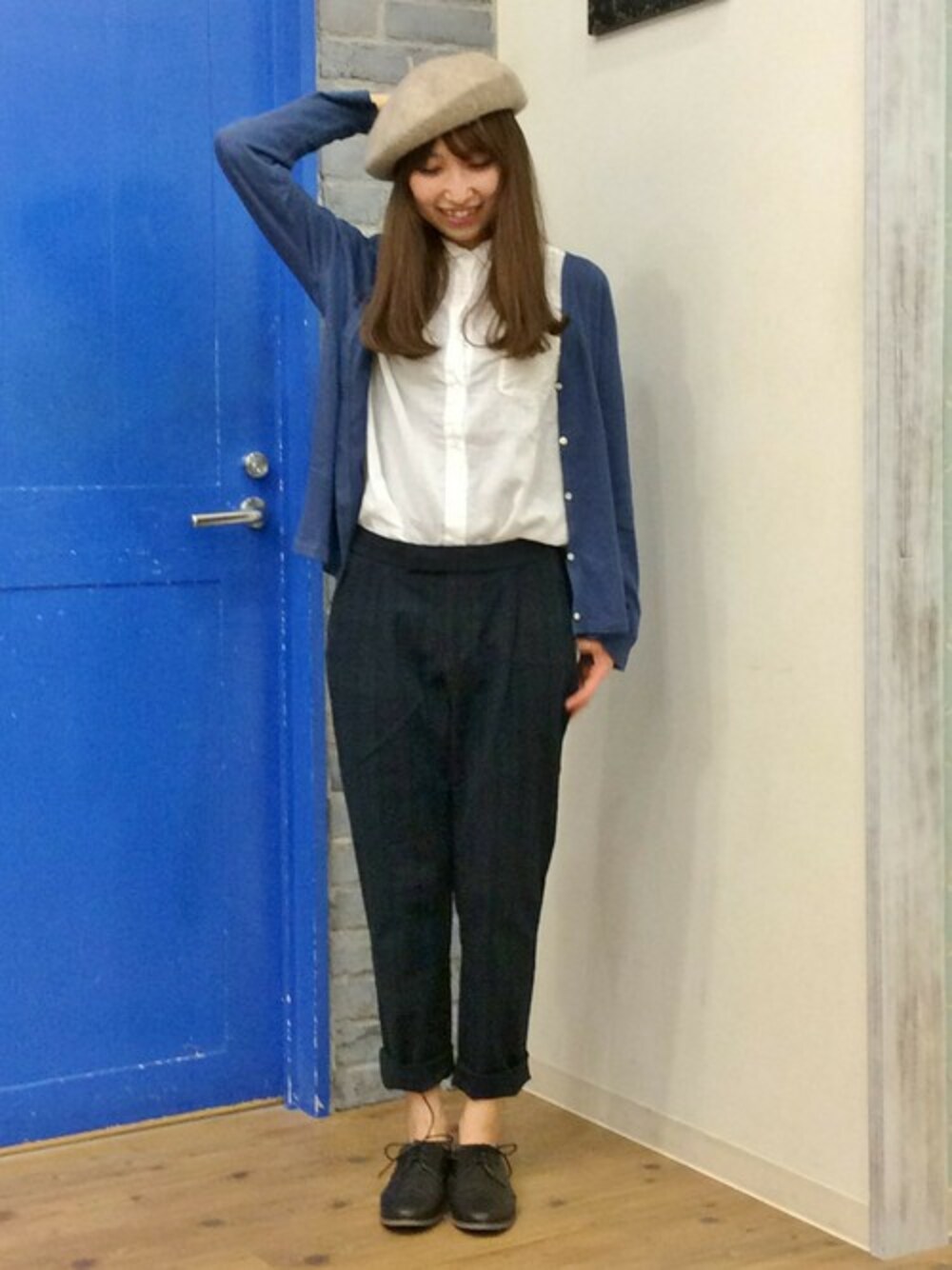 ナチュラルな感じでボーイッシュに決めてみました! カーディガン、チェックパンツとブルー系でまとめておとならしさもプラスしました。