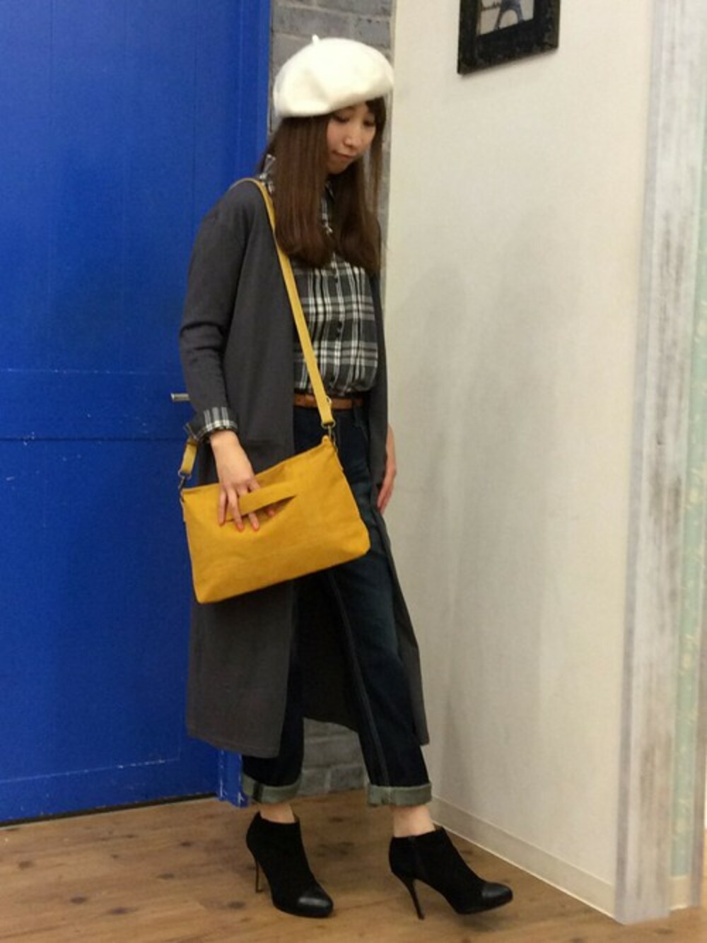 モノトーンコーデです♪チェックシャツにデニムのシンプルコーデですが、ミモレ丈のカーディガンが今年らしさを出してくれます。 シャツは小さなボタンがダブル使いになっていて、シンプルかわいいポイントです。 もちろん、ダブル使いのうち1つは飾りなのでボタンが沢山あって面倒なんて心配はご無用です。