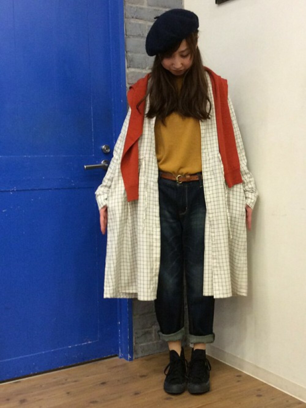 人気のウィンドペン柄のワンピースを羽織りで取り入れたコーディネートです。 オーバーサイズは今の気分。 今シーズン注目カラーのオレンジとイエローを取り入れました。 ベレー帽は人気のウィンドペン柄との相性バツグンです♪