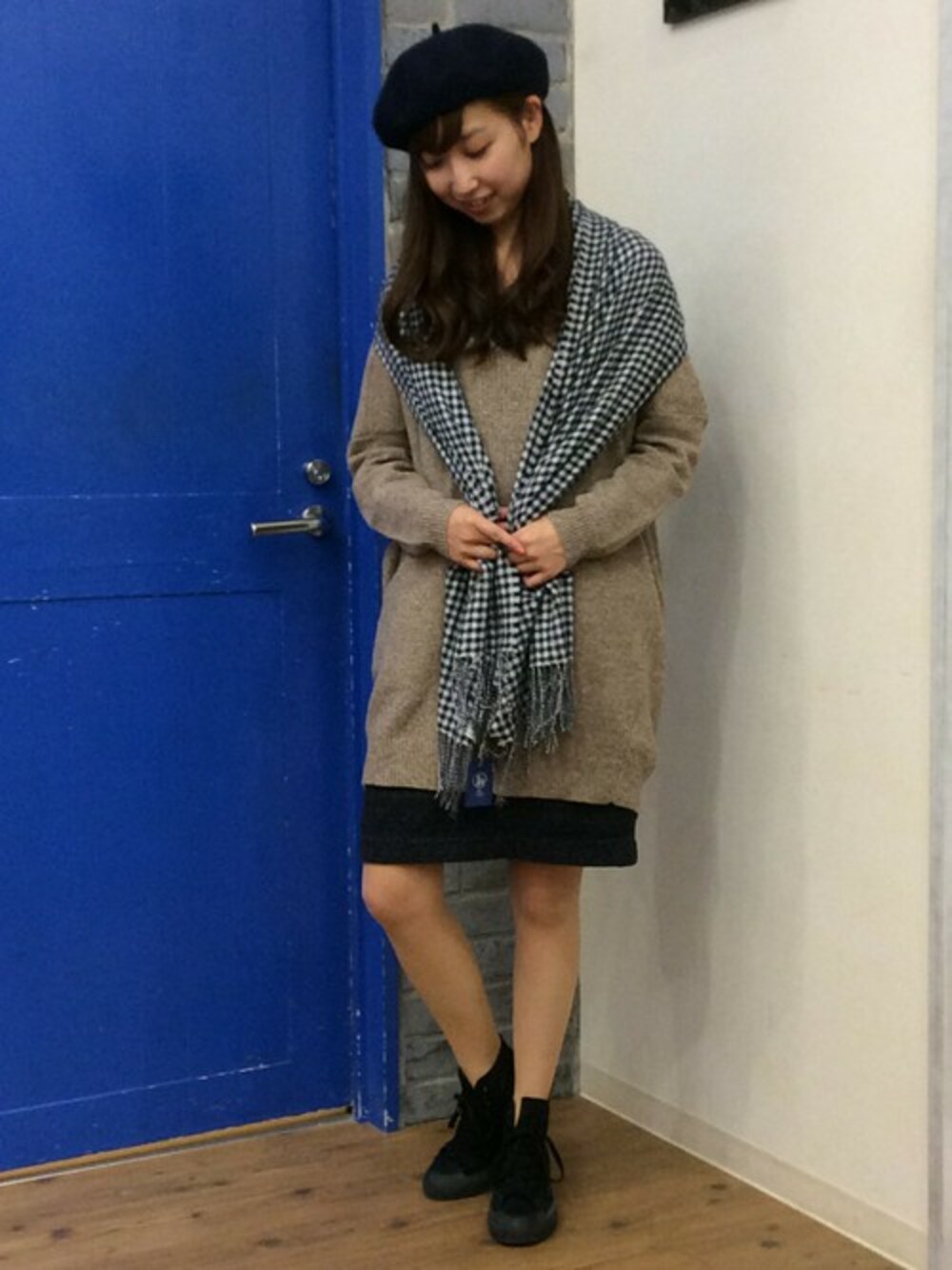 ニットワンピにタイトスカートを合わせたレイヤードスタイルです。 チドリのマフラーとベレーがプレップの雰囲気を出してくれています。 ニットはパンツスタイルもオススメ。スキニーと合わせると足が細くスタイル良く見えますよ♪