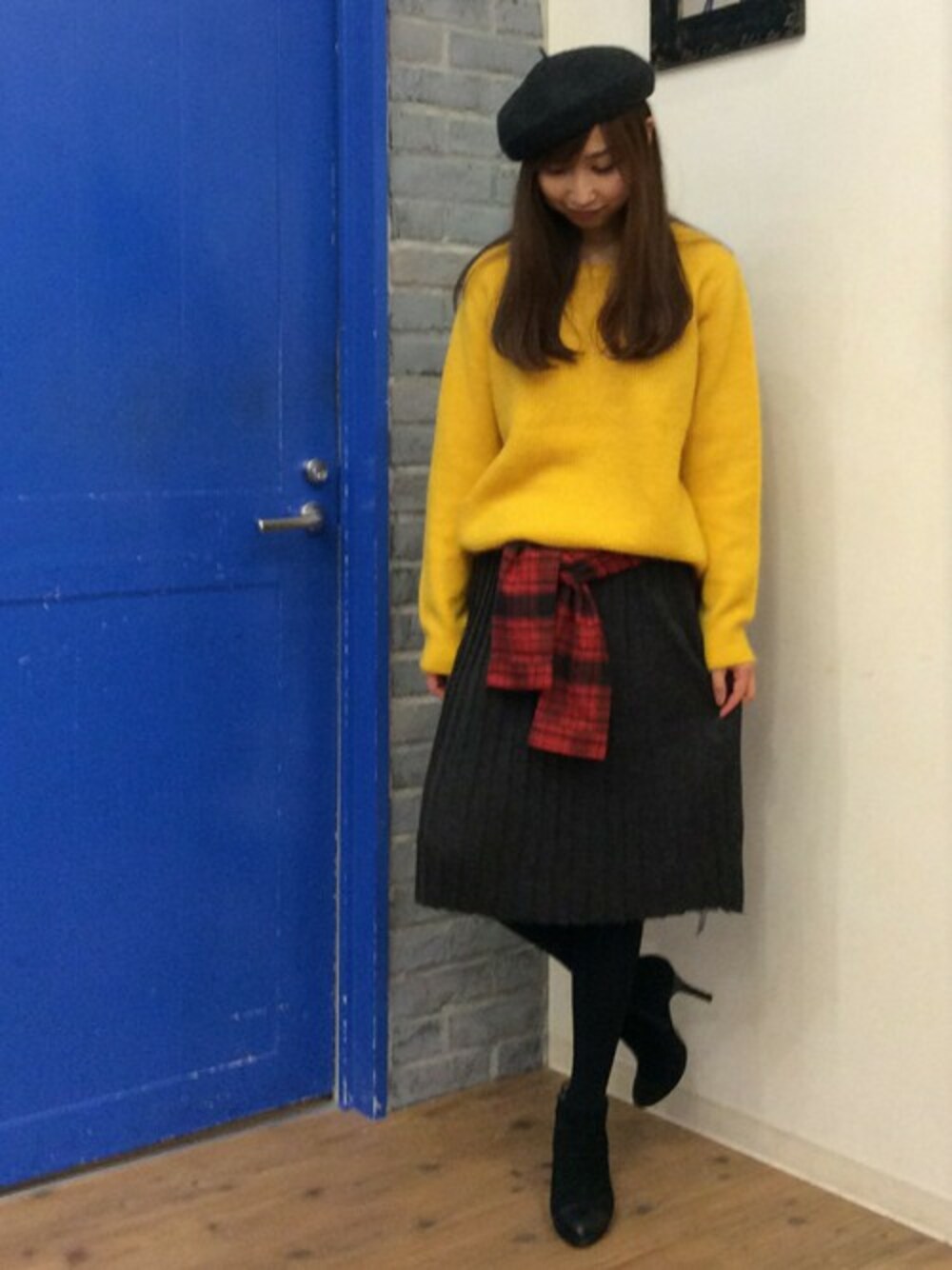 オレンジの発色がきれいなニットにプリーツスカートを合わせたスタイリング。 赤のチェックシャツを腰に巻いて差し色に使用しました。 ベレー帽にブーティとクラシカルなアイテムでまとめたおとなコーデです。