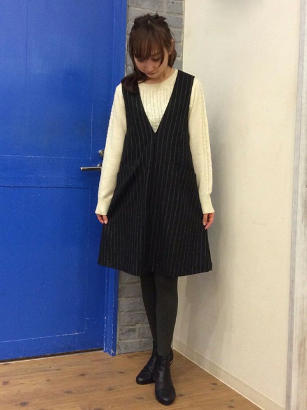 ストライプのジャンスカにケーブルニットを合わせたコーディネートです。 ワンピのインナーは無地のアイテムが相性◎ですが、ケーブルニットを合わせることでオシャレ度がUPします。 布地が大人っぽいので、子供っぽく見えがちなジャンスカも大人可愛く着られるデザインになっています。 シャツとベレーを合わせてプレップスタイルで着たり、ロゴパーカーを合わせてカジュアルな着こなしも◎