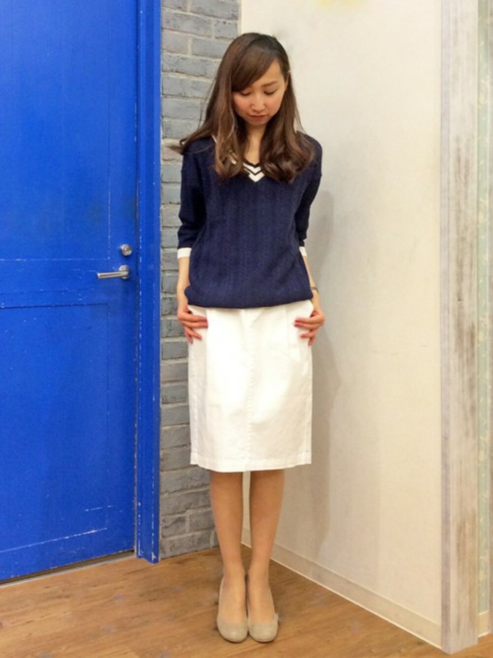 クラシカルな雰囲気のチルデンニット。 シンプルにニットとタイトスカートのスタイルです。 足元はパンプスをセレクトしおとなな印象をプラスしました。