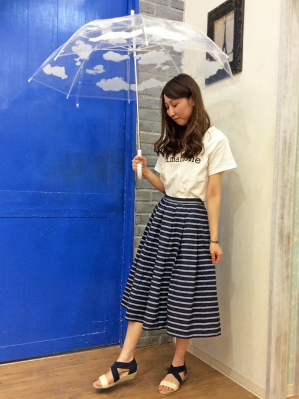 スリムな美シルエットのシンプルロゴtee。 プリーツ加工とボーダーの組み合わせが新鮮な表情のミモレ丈スカート。 憂鬱な雨の日は気分あがるアイテムで元気に♪