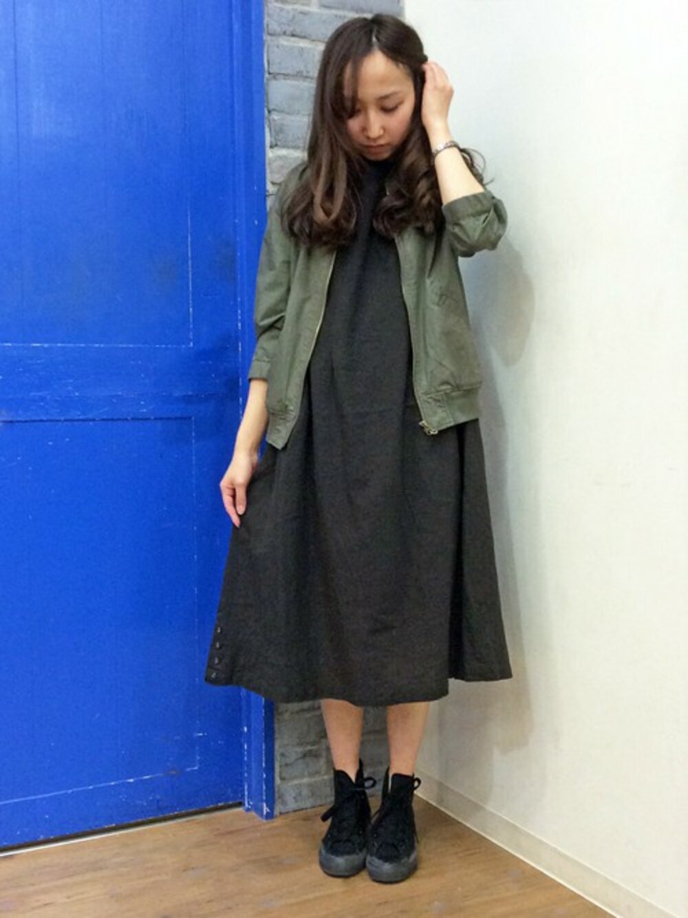 フェミニンなナチュラルワンピをカーキのブルゾンと合わせて、おとなな印象のコーディネートです。 ワンピースは胸下の両サイドにタックが入ったフェミニンなデザイン。 ブルゾンはリブ使いがハードな感じ漂いますが、フェミニンなアイテムやキレイ目コーデにプラスすると今年らしさUP!おしゃれ感UP!間違いなしです♪