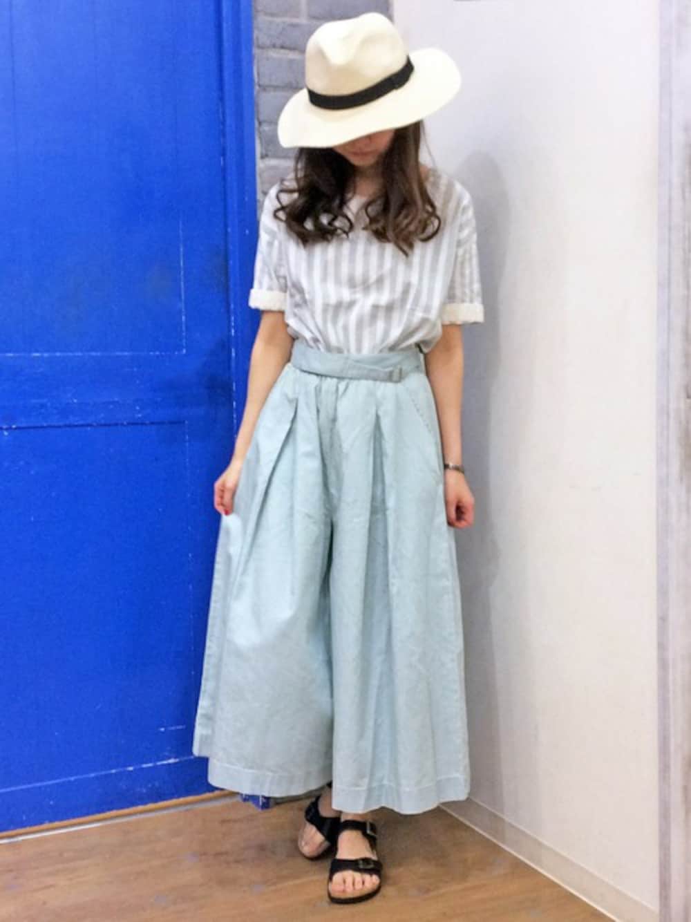 夏にぴったりのきれいめコーディネートです。 トレンドのガウチョパンツにトップスインして腰まわりをスッキリ♪ ハットのリボンとサンダルを黒にして、全体のふんわりシルエットをシャープにまとめました。