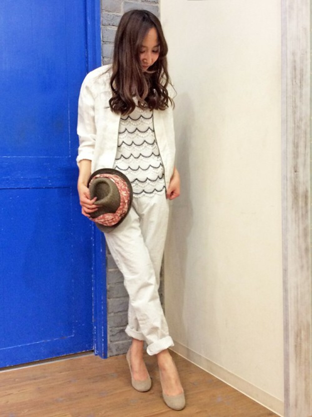 天気のいい日に着たくなるオールホワイトのコーディネートです。 リネン素材のブルゾンに、なみなみレースボーダーのはいったカットソーをあわせて、リラックス感のあるきれいめスタイル♪ 中折れハットは、ボタニカル柄のヘアバンド付き。さりげなくトレンドが取り入れられます。