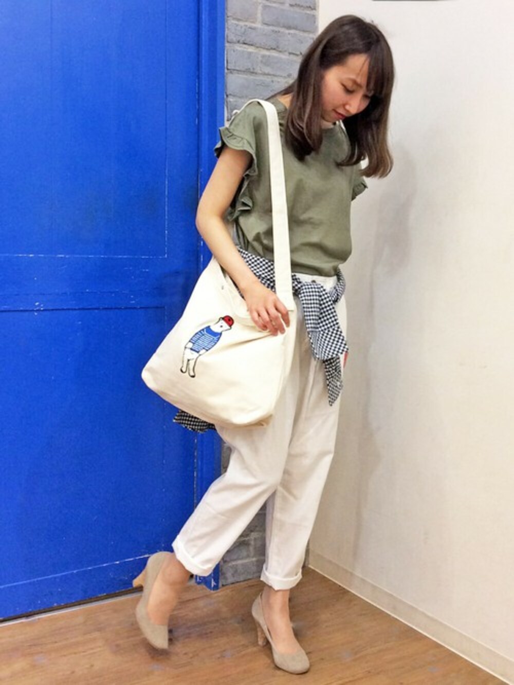 トレンドのカーキを使用した、ゆるっとカジュアルコーディネート♪ 袖のデザインがかわいいカットソーに、リラックス感のあるテーパードパンツを合わせました。 ネイビーのギンガムチェックシャツが全体を引き締めてくれます。