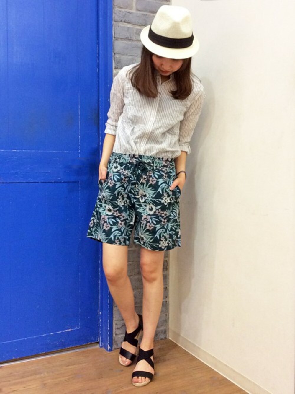 夏を意識したボタニカルコーディネートです。 トレンドのボタニカル柄のショートパンツにストライプのシャツをプラス。 小物は、メンズライクなモノトーンであわせてアクセントにしました♪