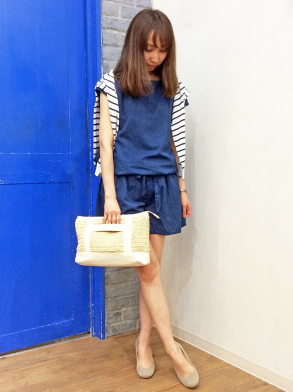 ネイビー×ホワイトでまとめた爽やかなコーディネートです。 サロペットは、デコルテラインが程よく見えるネックラインと袖のデザインがスッキリ見えのポイント。 シンプルなので、柄物やカラーアイテムと相性◎です。 ボーダーのカーデを肩掛け&天然素材のバッグで夏らしさがUPします♪