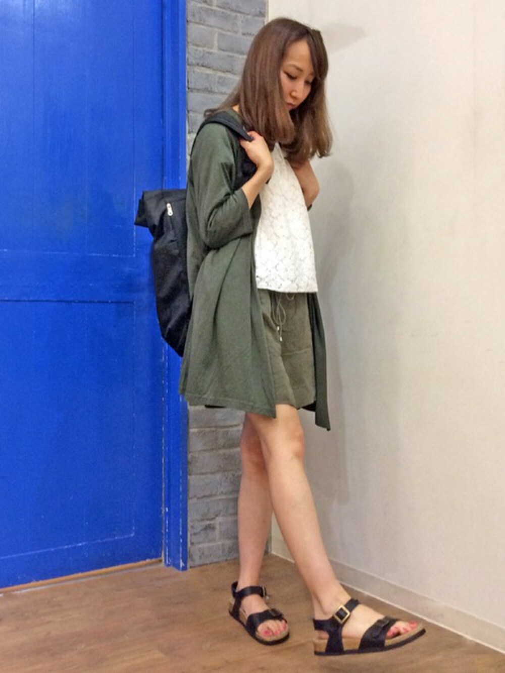ハードなイメージのカーキアイテムに、レースをあわせたミックスコーディネートです。 きれいな白のブラウスは、レースと無地のリバーシブルでその日の気分にあわせて楽しめる一枚。 ボトムスは、スカートにみえて実はショートパンツ!なので素足でさらっと着れます。 小物は、クロで統一。全体を落ち着いた色味+カラー数を抑えるのがポイントです♪