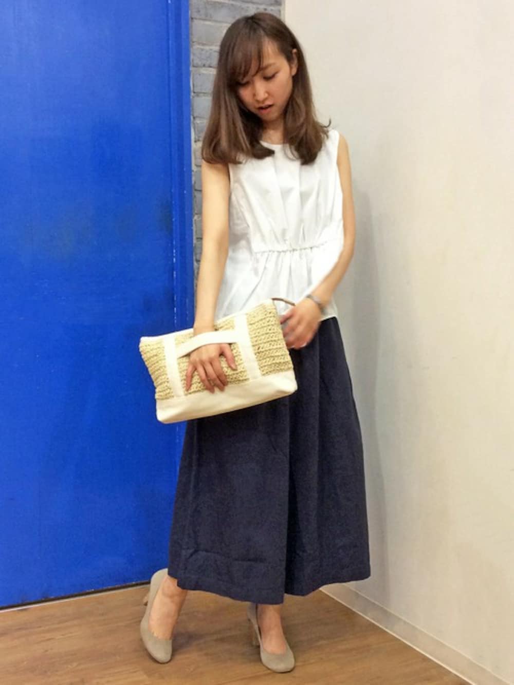 ホワイト×ネイビーが清楚な印象の大人のきれいめコーディネート。 ノースリーブブラウスは、ウェストにギャザーがはいってウェストラインをスッキリみせてくれます。 ボリューム感のあるガウチョパンツをあわせることで、メリハリのあるスタイリングに♪ 小物は夏らしい素材のバッグと大人の女性らしいパンプスをセレクトしました。