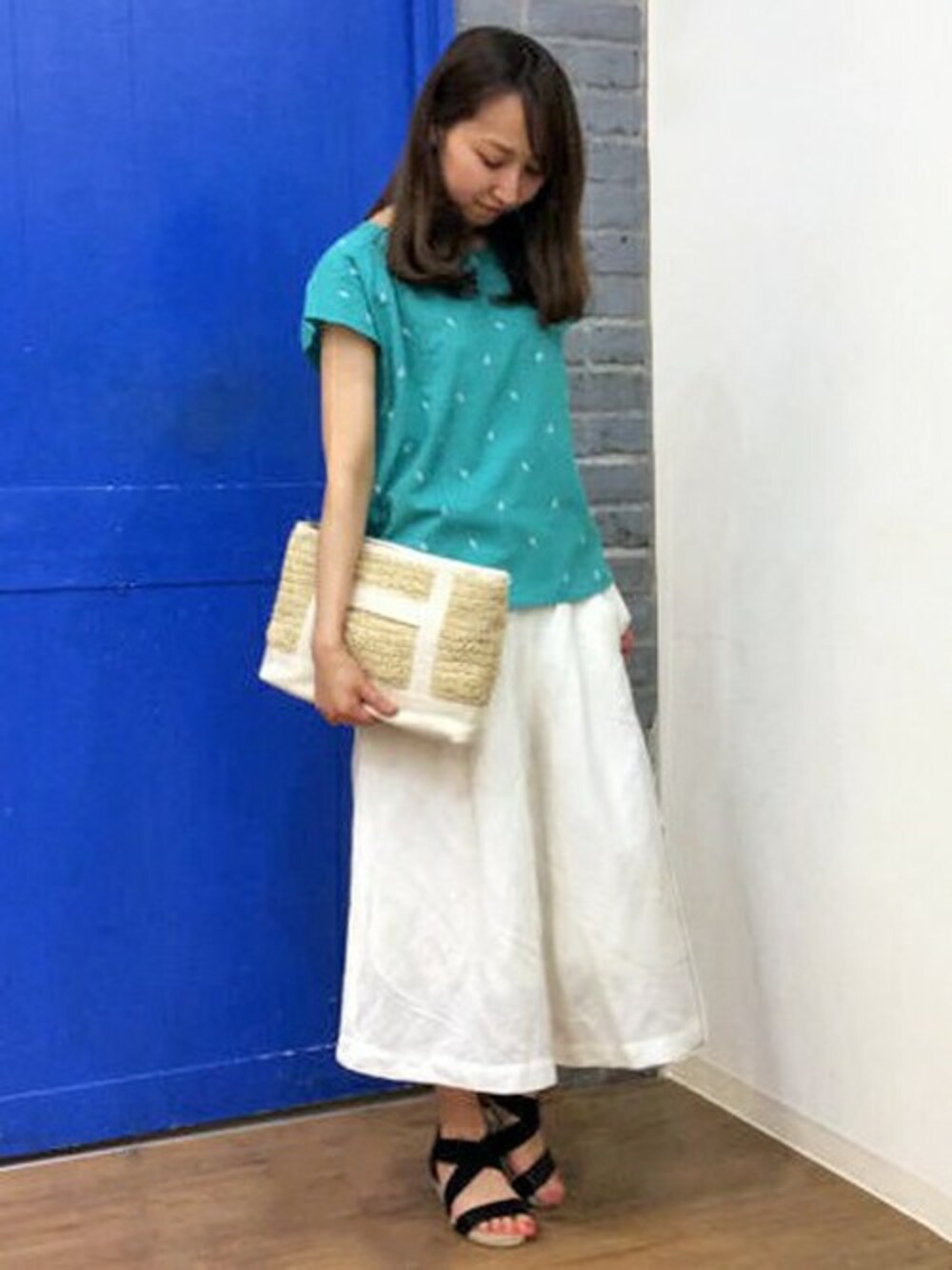 夏らしいきれいなグリーン×ホワイトの爽やかコーディネートです。 エメラルドグリーンのブラウスは、ドットにみえるバブル柄の刺繍がポイント。 フレンチスリーブ&バッグボタン仕様になっているなど、こだわったデザインになっています。 暑い日もさらりとした着心地のリネン素材を使用したガウチョパンツをあわせると今年らしさがUPします♪