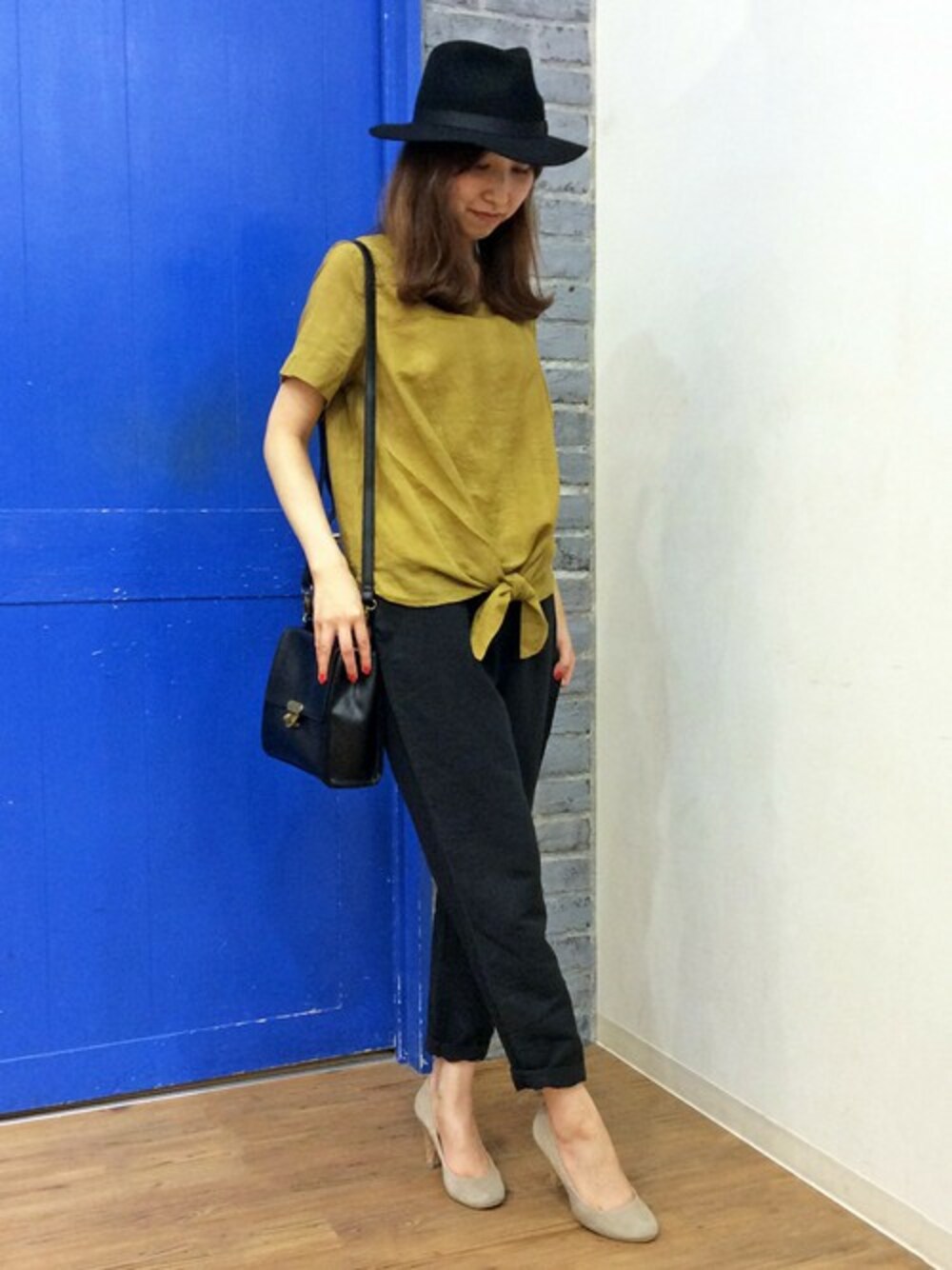秋をカラーで先取り♪大人カジュアルコーディネートです。 マスタードのブラウスは、裾リボンが全体のアクセントになる上に、女性らしい雰囲気をプラスしてくれます。 小物も秋素材・カラーを意識してまとめるとよりシックなコーディネートに♪