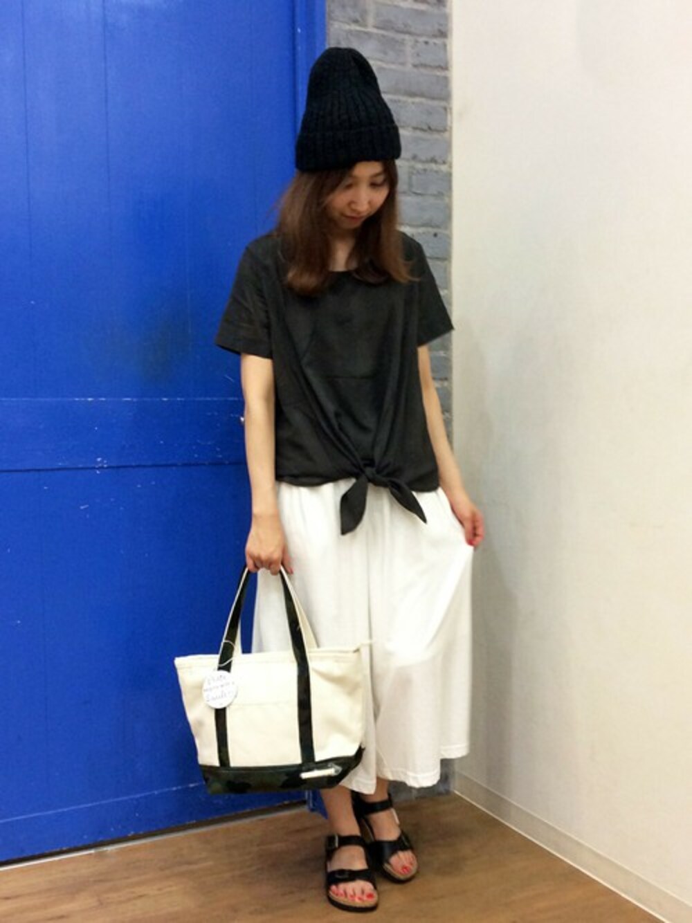 ラフなモノトーンコーディネートです。 ゆったりシルエットのブラウスは、前縛りがワンポイント。 シロのガウチョをあわせると今年らしい着こなしになります。 小物は、ボーイッシュなごつめのタイプではずすのがおすすめです♪