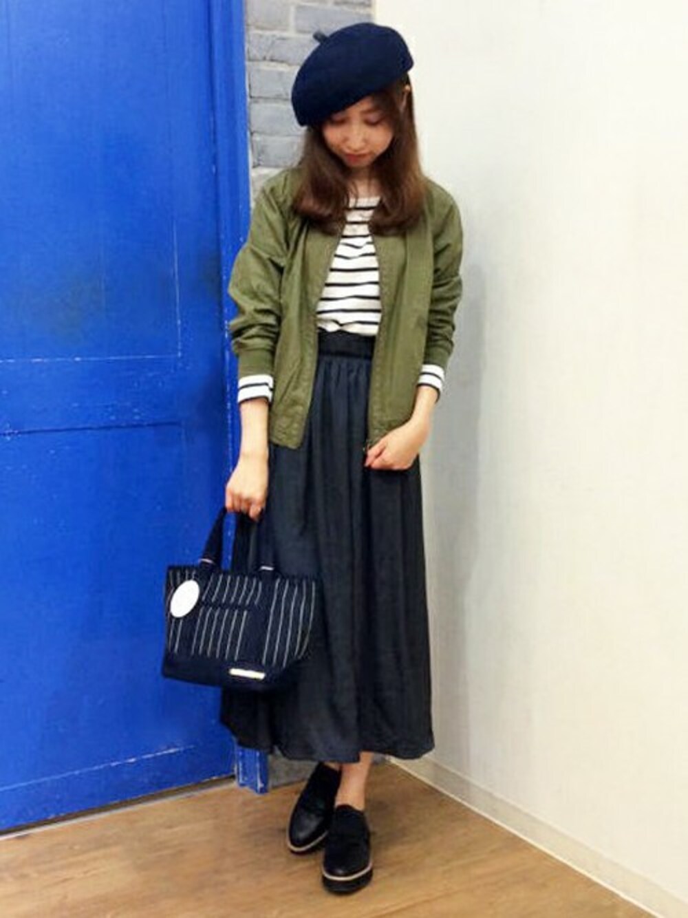 秋のきれいめ大人カジュアルコーディネートです。 トレンドのカーキのブルゾンにボーダーをイン。 ボトムはサテンのスカートできれいめなテイストを取り入れました。 メンズライクなカーキのジャケットもノーカラー+ゴールドのファスナーでさりげなく女性らしさが際立ちます。 7部袖なので、インナーの袖を見せてコーディネートを楽しめます♪