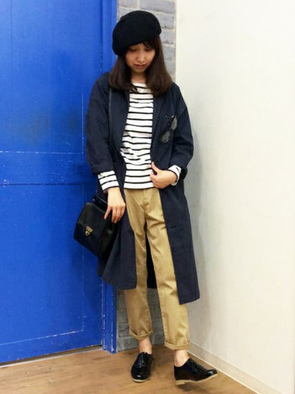 大人気のチェスターコートメインのコーディネートです。 コートは、メンズライクなデザインながら、やわらかい素材使いでボディに沿うしなやかなシルエット。 長めの丈なので、パンツにもスカートにも合わせやすい一枚です。 インにボーダーT+袖ロールアップでカジュアルダウンしてみました♪