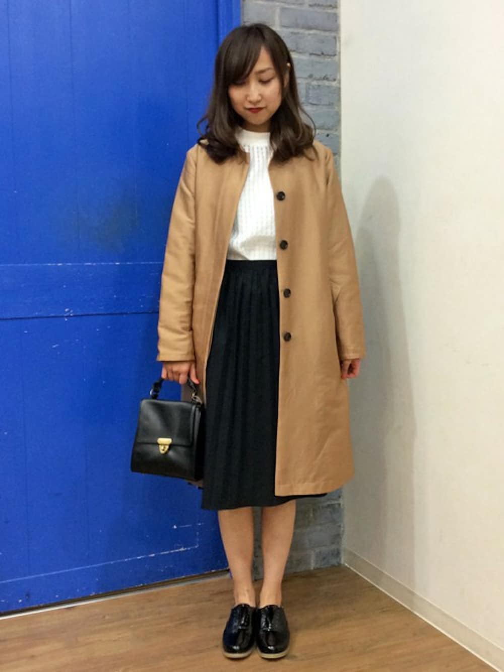 シンプルにきれいにまとめたおでかけコーディネートです。 インナーと小物はモノトーンで、光沢あるコートが引き立ちます。 プリーツスカートにチビネックのトップスでさり気なくトレンドを取り入れて♪