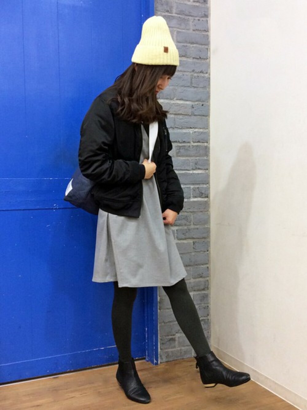 カジュアルミックスなワンピーススタイルです。 シンプルなワンピースは、ボリューム袖と今年らしいワイドシルエットで、一枚でサラリと着れるアイテム。 注目のMA-1やニット帽とあわせて、スポーツテイストにしてみました♪