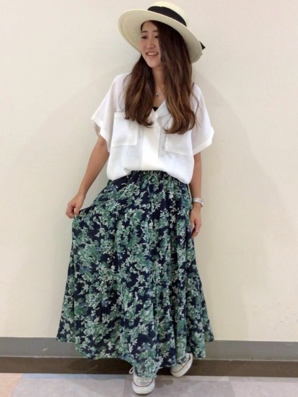 トレンドの花柄コーデ。 ティアードフレアでもすっきりとした縦シルエットを意識してつくられたスカートは、ウエストは総ゴムでらくちん♪ ボトムINでメリハリシルエットを作るのがおすすめです。