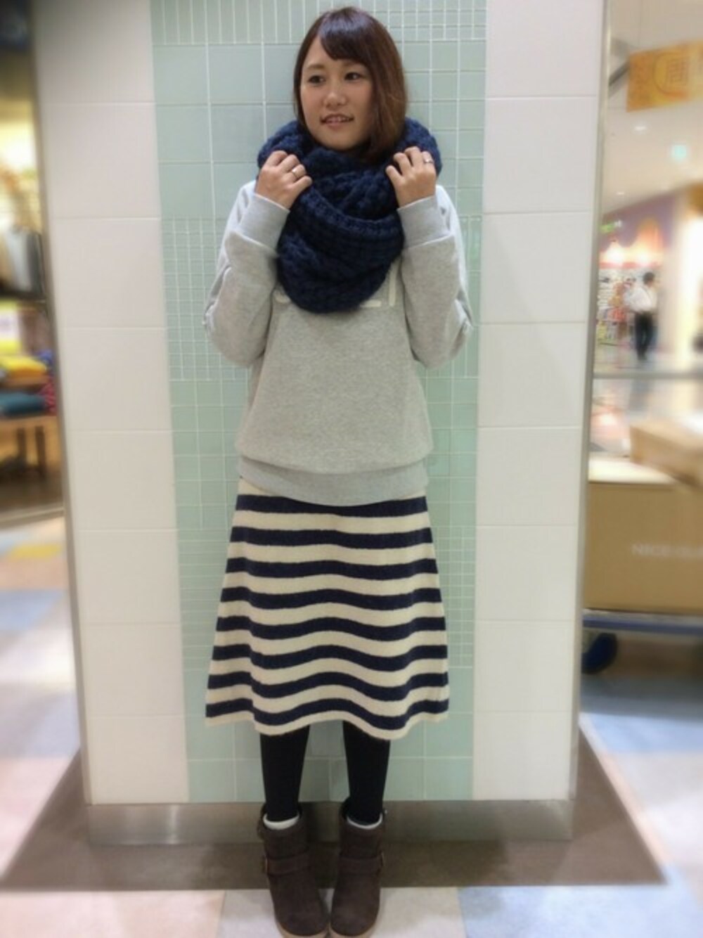トレンドアイテム、ロゴスウェットにボーダースカートをあわせたカジュアルコーディネート。 ボーダースカートはニット素材で見ためも暖か。裏地付きで使い勝手も◎ スヌードで重心を上にもっていくシルエットも今シーズン人気です♪
