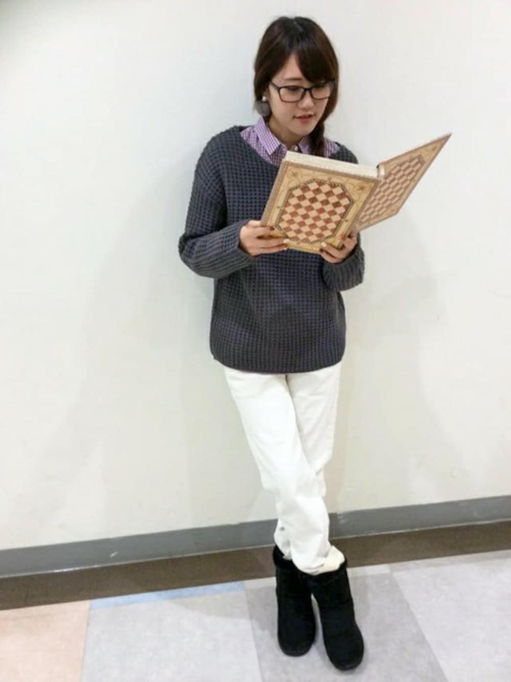 ざっくりシルエットの畔編みニットをメインにモノトーンカラー中心にまとめました。 トップスは首回りにゆとりを持たせているので、今回のようにシャツを合わせたり、トレンドのタートルネックを合わせるのがおすすめ。 冬の代表アイテムムートンブーツにホワイトパンツを合わせるのが今年流♪