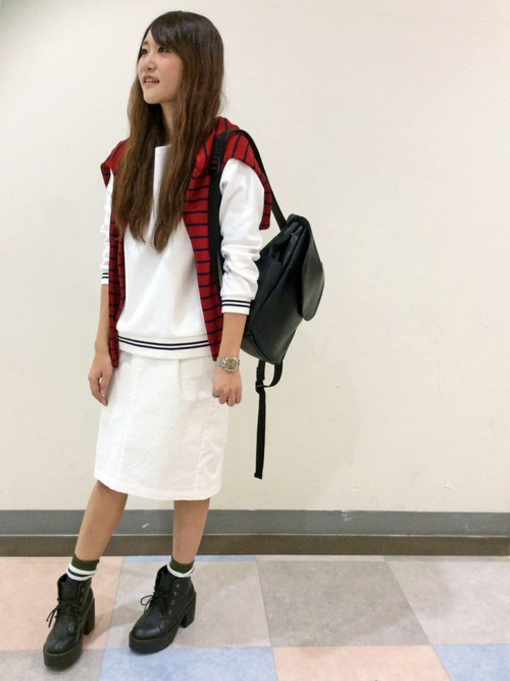 春になればトライしたいオールホワイトコーデ。 トレンドのスポーツミックススタイルです。 カーディガンに見えるストールをポイントカラーに、小物は反対色のブラックでまとめてバランスをとりました。