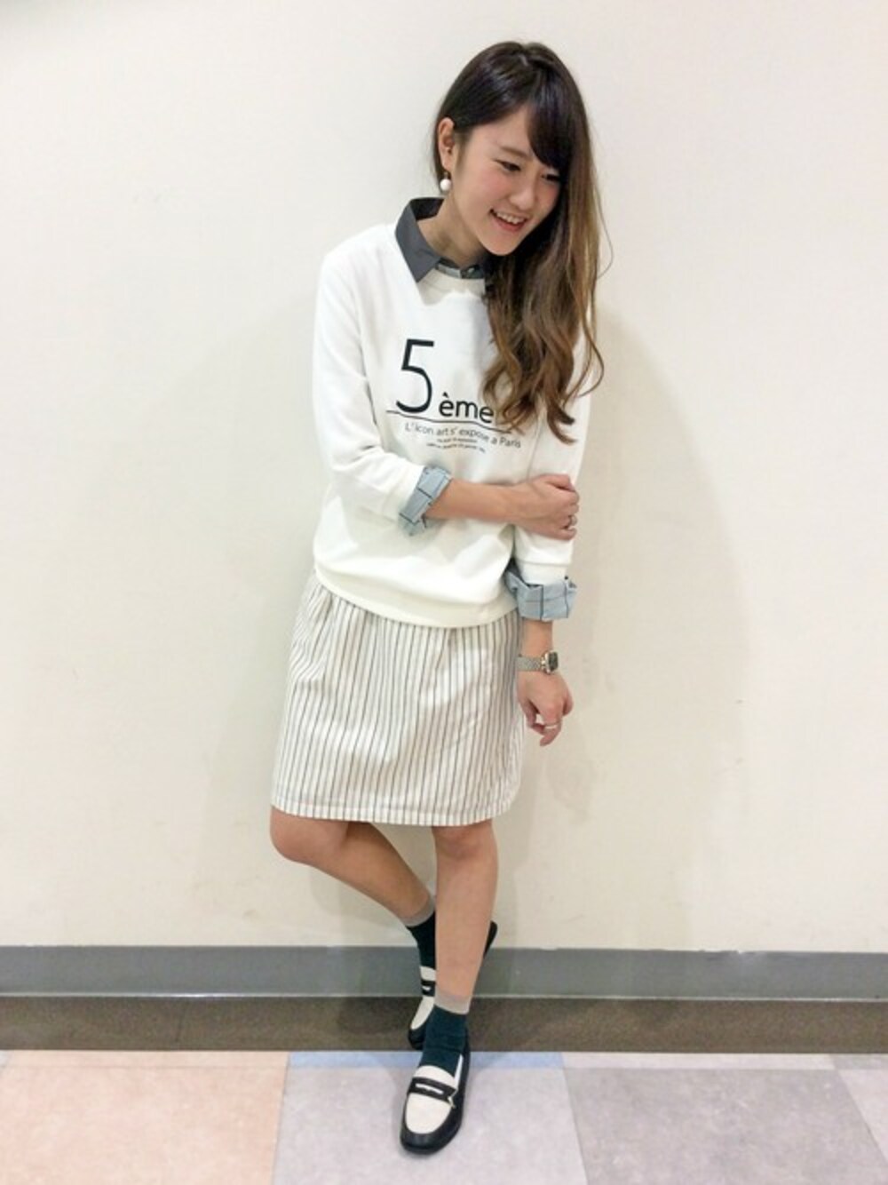 春先どりオールホワイトコーディネート。 引き続き人気のスウェットはスカート合わせが◎ スカートはネクストブレイブNo1ストライプ柄が目を引きます、 バイカラーのローファーで少しのこだわりをプラスしました♪