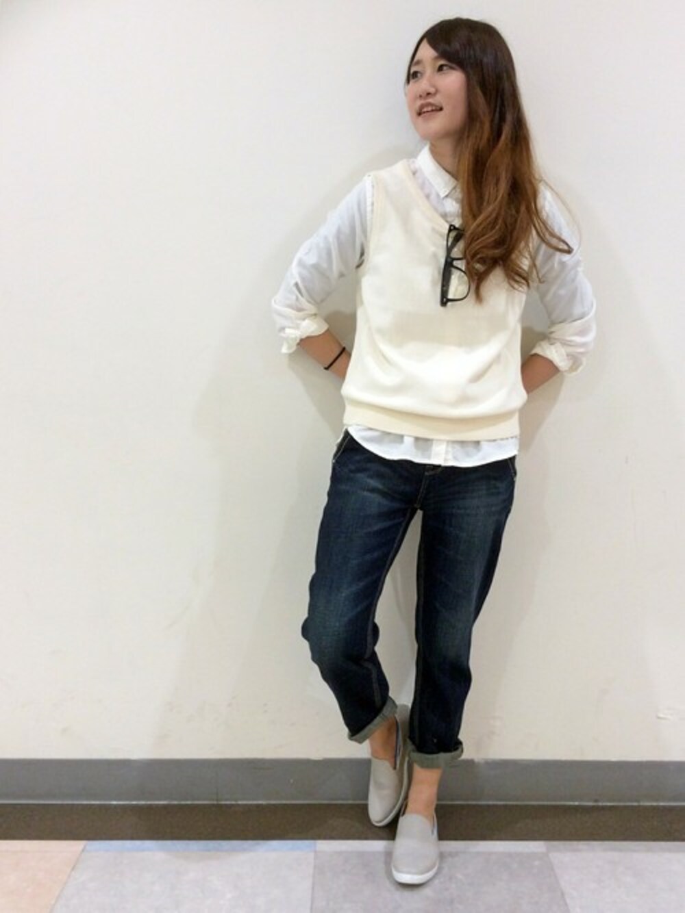 サマーベスト×シャツの優等生コーデ。ホワイト×ホワイトが印象的。 +めがねがよりムードを高めます。 ボトムにはデニムパンツ、そしてスリッポンとカジュアルな合わせが今年流です。