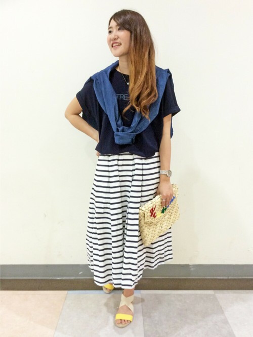 きれいめスカートにカジュアルなTシャツをあわせたミックスコーディネート。 プリーツのはいったボーダースカートは、ミモレ丈で気になる部分をカバーしてくれます。 トレンドのイエローのはいった雑貨をあわせてポイントにしました♪