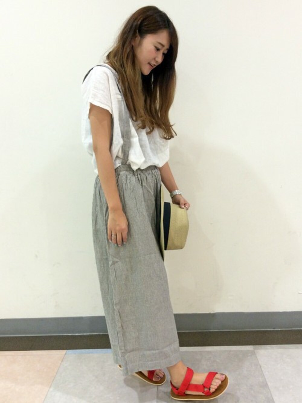 トレンドのガウチョをメインにした楽チンコーディネート。 サス付きガウチョは、リネンコットン素材で暑い季節も着心地◎。 サスペンダーは取りはずしできるので、その日のコーディネートにあわせてアレンジできます♪ ウェアはナチュラルカラーのゆるい雰囲気なので、アカのスポーツサンダルでピリッとさせたミックススタイルです。