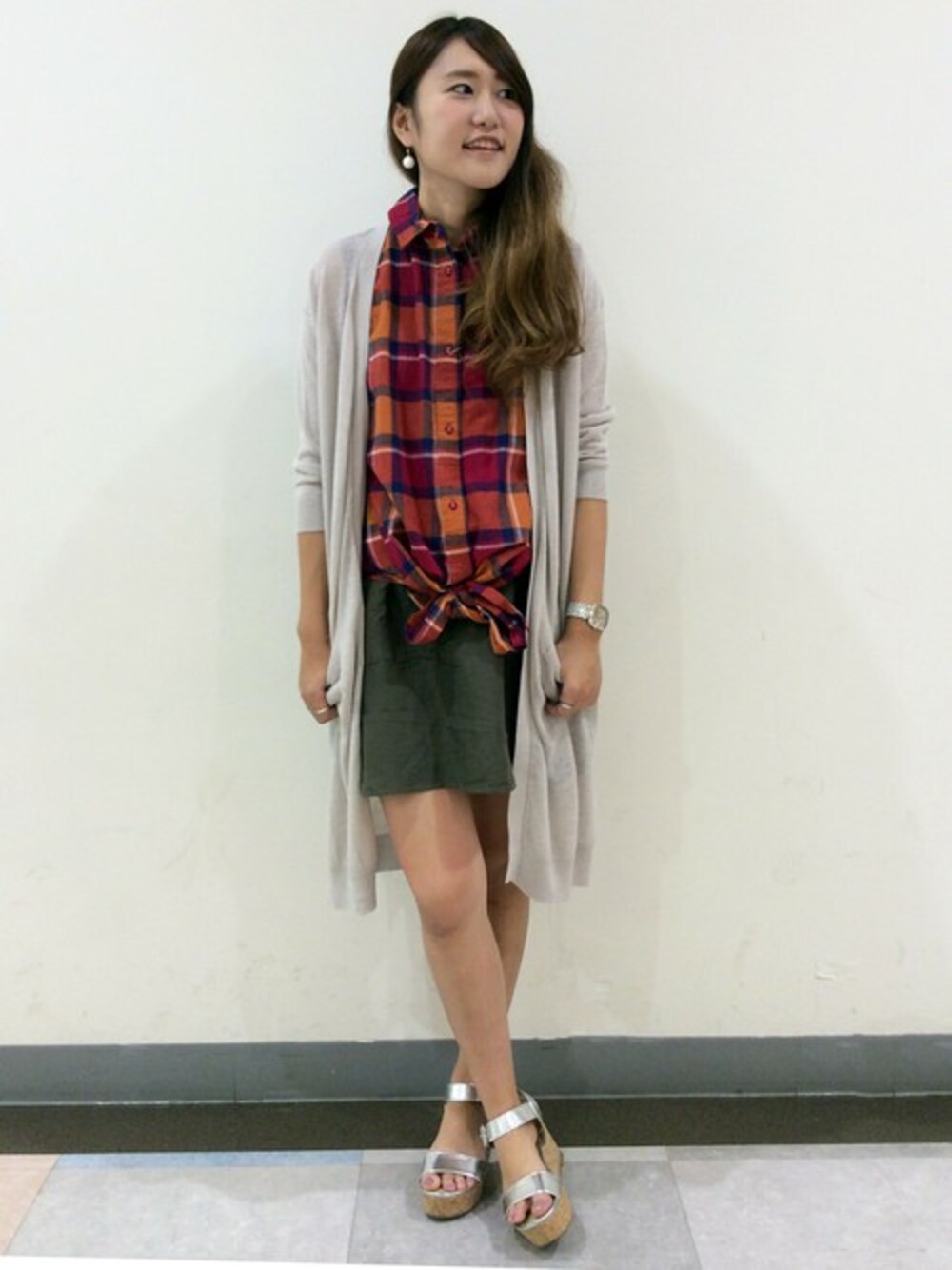 夏らしい元気なカラーのカジュアルコーディネートです。 チェックシャツは、最初から前結びのデザインになっているので、結んだあともゆったりとした着心地。 カーキのボトムスは、スカートにみえて実はショートパンツなので丈を気にすることなく素足でさらりと着れるのがうれしい一枚です。 リネンのはいった涼しいリネン素材のロングトッパーをあわせると今年らしさがUPします♪