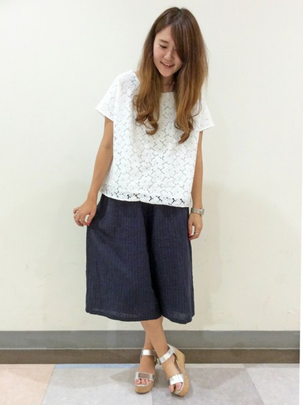 ホワイト×ネイビーの夏らしいコーディネートです。 着心地のいいリネン素材のガウチョは、今シーズンのトレンドの丈感とボリューム感。 華やかな総レースのブラウスは、その日の気分にあわせて楽しめる無地とのリバーシブルです♪
