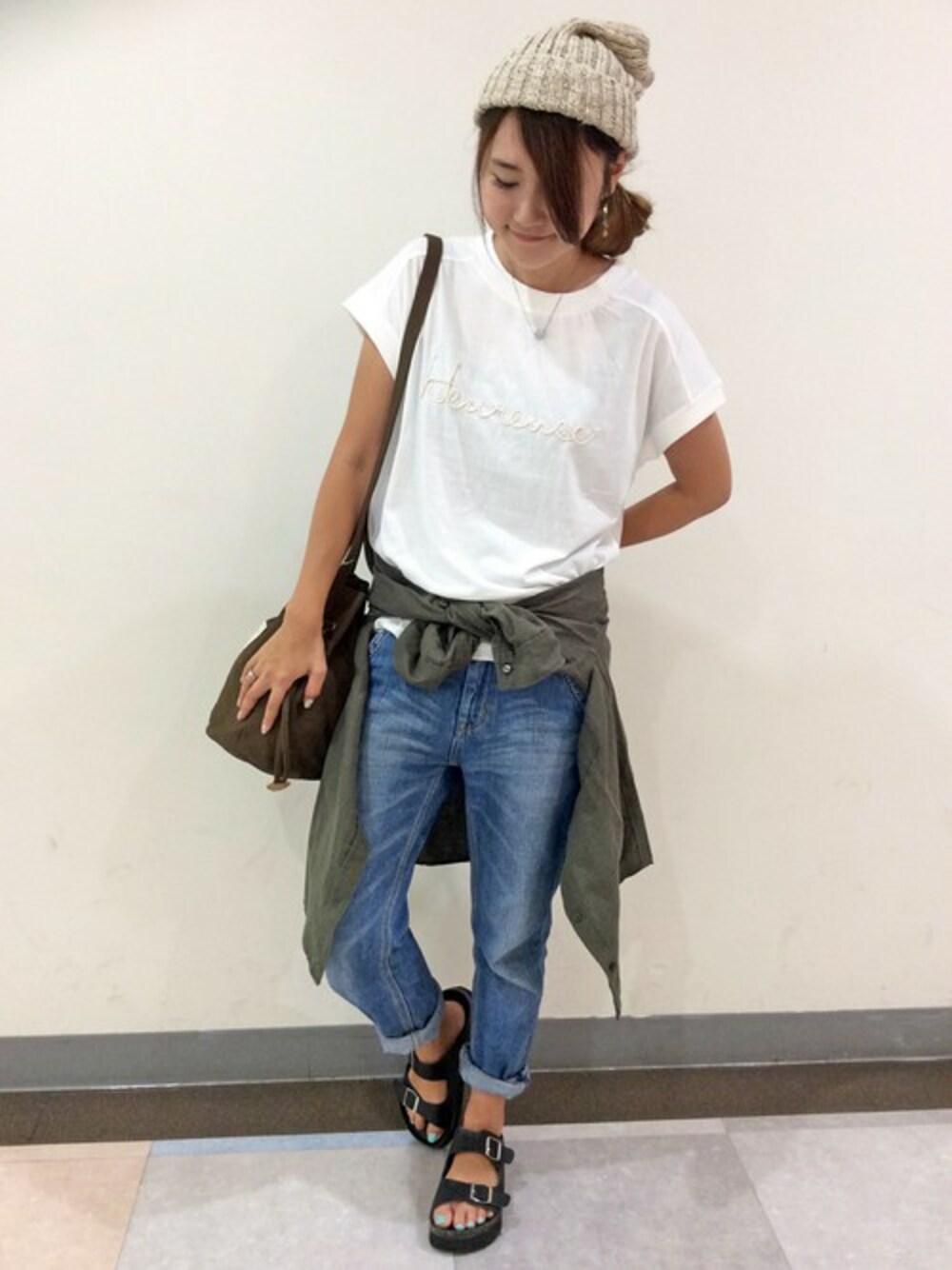 Tシャツ+デニムのシンプルなカジュアルコーディネートです。 一見無地にみえるTシャツは、ロープ刺繍がポイント。 カーキの腰巻きシャツ+ニットワッチで秋を先取りです♪