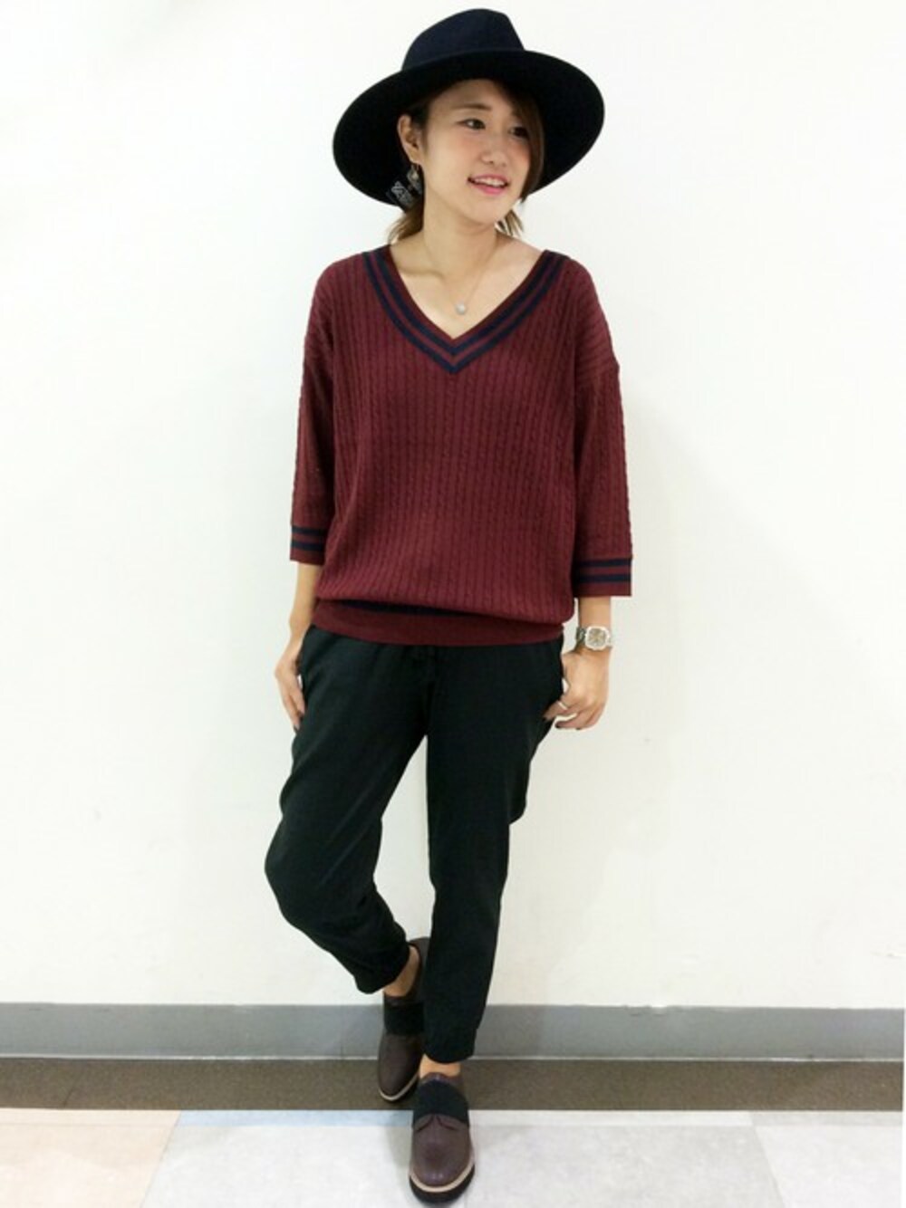 この秋注目のマニッシュコーデ♪ 人気のチルデンニットは、パンツをあわせるとメンズライクに、スカートをあわせるとプレッピーな雰囲気に、とアレンジの楽しめるアイテム。 シンプルにVネックで着てもインにシャツを重ねてもいいですね。 夏から引き続き人気のつば広ハットをあわせると、目線がUPして全体のバランスがよく見えるのでおすすめです♪