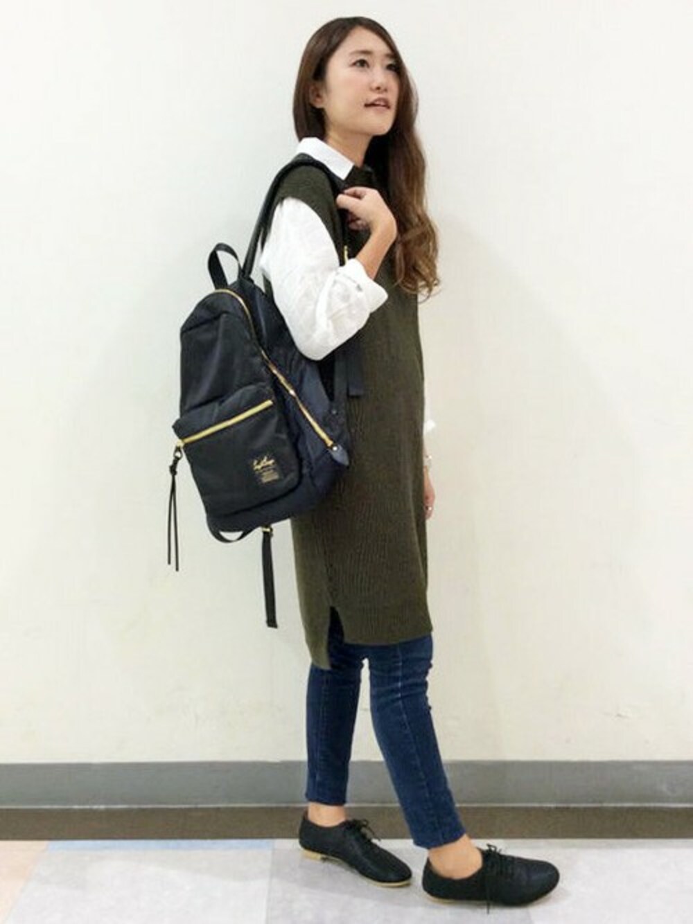 オフにおすすめのパンツコーディネートです。 トップスは、この秋冬トレンドのシャツ×ニットベストのレイヤードスタイル。 ロング丈のベストは、裾スリットが入っている動きやすいデザインになっています。 カーキ×デニムの組みあわせに、リュックとレースアップシューズの黒をあわせると全体が引き締まります♪