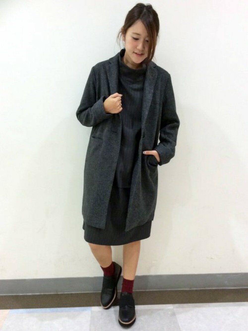 人気のチェスターコートをとりいれたオトナコーディネートです。 あったか素材のチェスターコートは、シンプルな一つボタンでどんなテイストにも着まわしやすい一枚。 インは、セットアップにみえるワンピース。ハイネック&リブ使いが今年らしいデザインです。 さりげなくはいったストライプが大人っぽい雰囲気♪