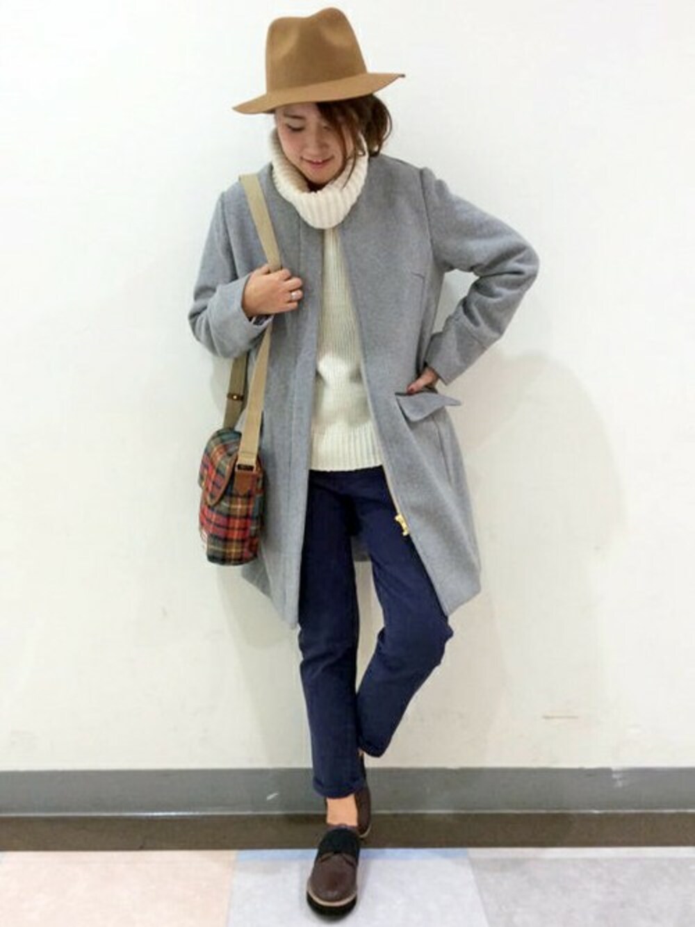 人気のボリュームネックにIラインを意識したコーディネートです。 トレンドに左右されないプレーンなアウターは、毎日の着こなしに重宝すること間違いなしです。 インは、タートルネックニットにスリムなパンツをあわせてすっきりと。 キャメルのはいったハットとバッグをアクセントにしました♪