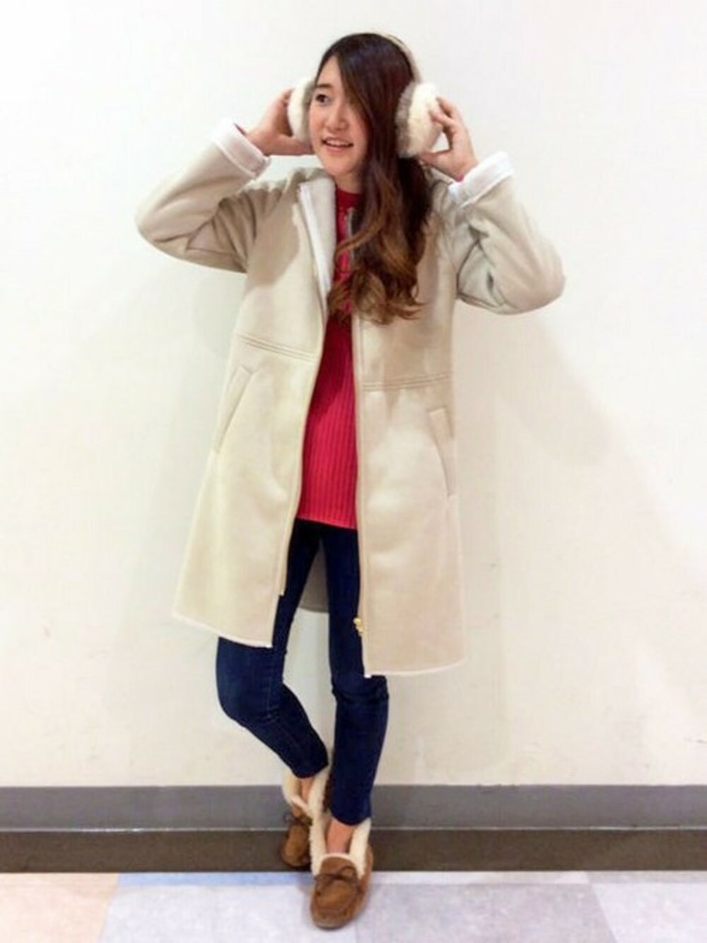 ムートンコートをとりいれたカジュアルコーディネートです。 ノーカラーのムートンコートは、ほどよいきちんと感できれいめスタイルにはもちろん、カジュアルスタイルにも着まわしやすいのがポイント。 インは、リブニットと細身のパンツですっきりと。ニットは明るめカラーにすると全体の雰囲気がよりカジュアルになります。 ムートンにあわせて、ファーのついたイヤーマフをアクセントにしました♪