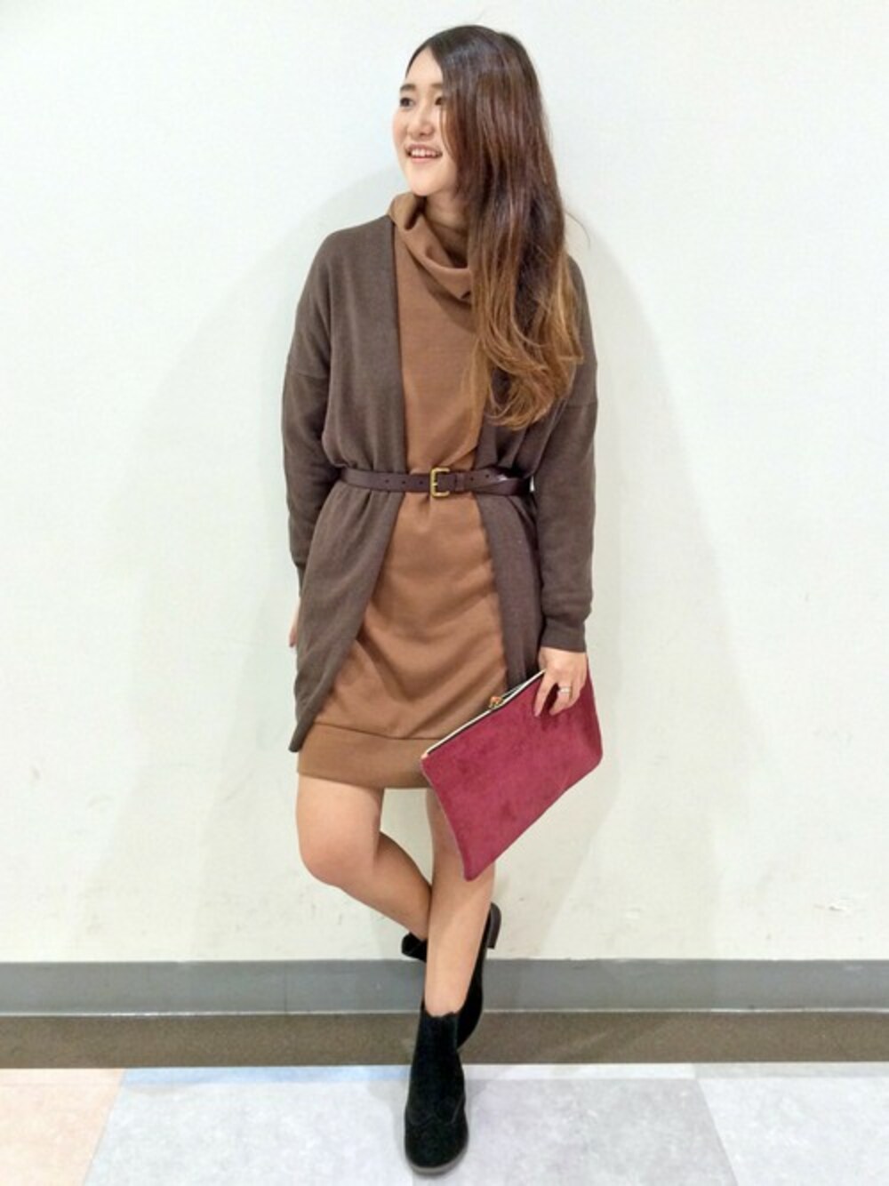 少し大人っぽさを意識したオフタートルワンピ×ロングカーデのスタイリング。 ベルトでのウェストマークがコーディネートポイントです。 ブラウン系のカラーにはレッドの差し色がおすすめです。 また足元にダークカラーをもってくれば全体間をまとめてくれます。